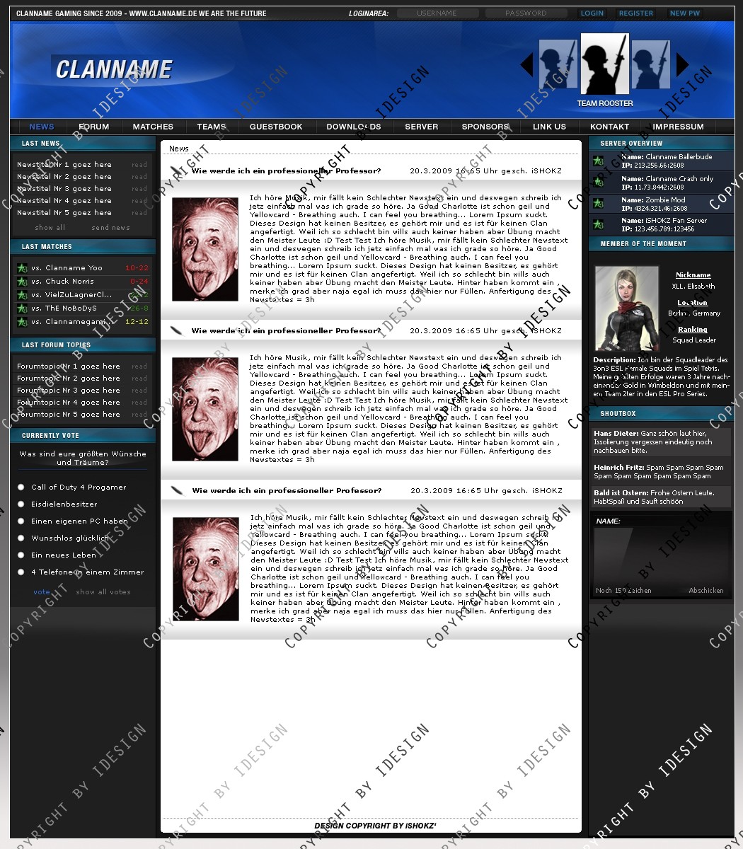 Dies ist ein professionelles Clandesign. Eine übersichtliche und geordnete psd Datei mit allen vorhandenen Ebenen ist vorhanden. Bei weiteren Fragen oder Support wenden sie sich per E-mail an "[email protected]" Dieses Design gibt es auch in blau. Schaut bei meinen Produkten