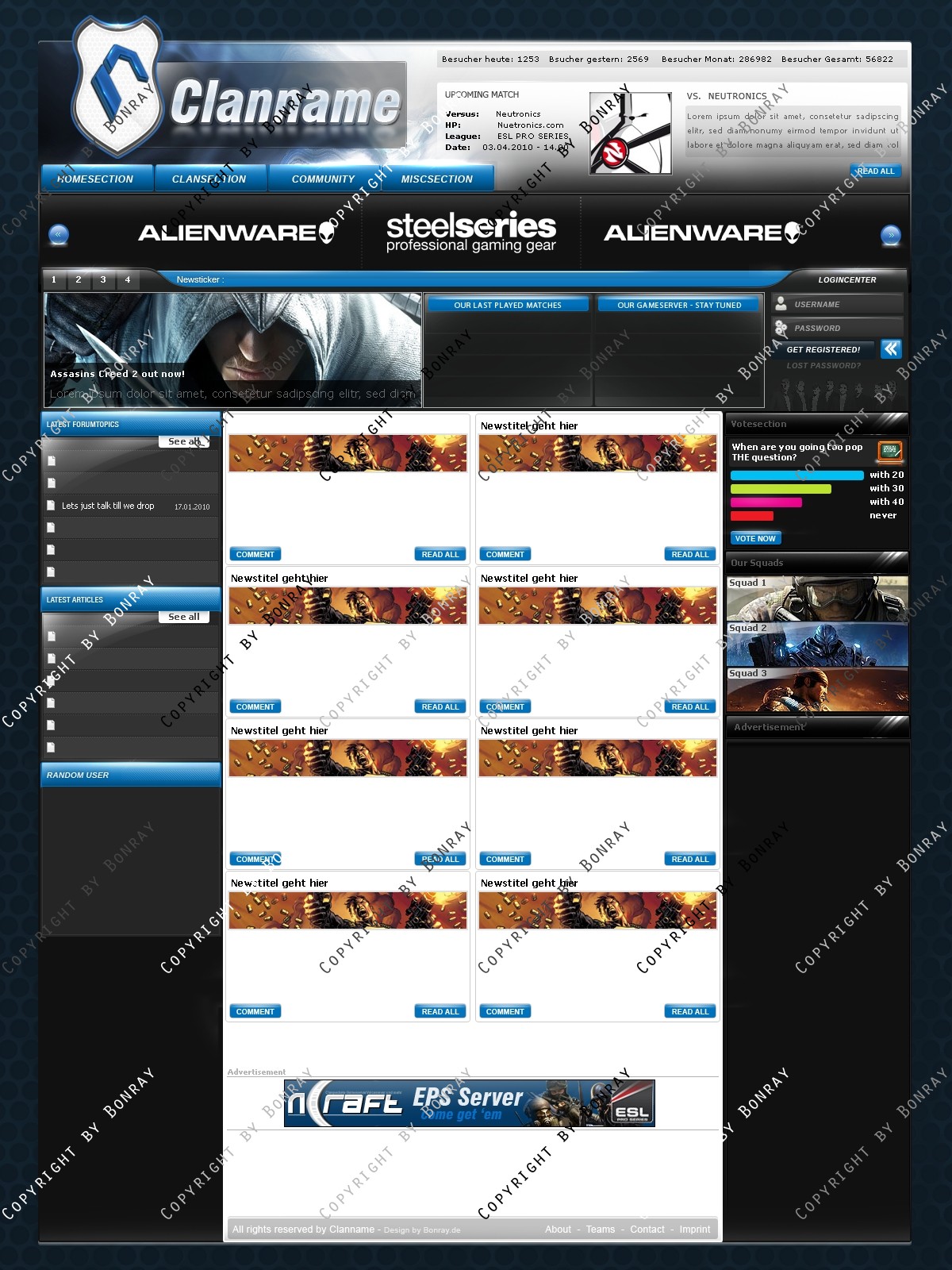 ich biete hier ein frisches, hochwertiges Clandesign in modernen Farben an. Das Design lässt sich einfach slicen und aufgrund des simplen Aufbaus leicht an gängige CMS Systeme wie Webspell und DZCP anpassen. Das Design lässt sich eigenhändig mit allen gängigen Photoshop Version bearbeiten.